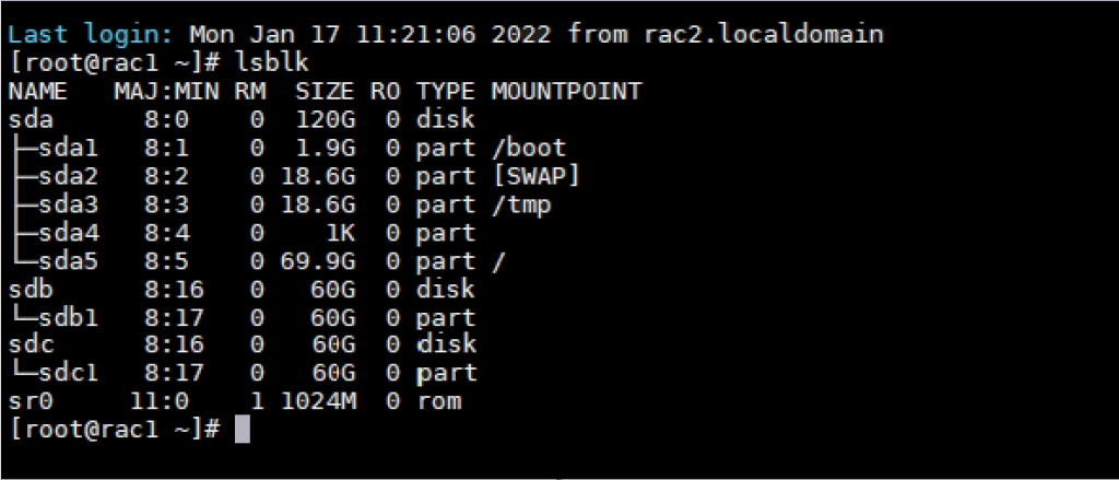 ORACLEASM_USE_LOGICAL_BLOCK_SIZE=”false”Partition işleminden sonra disklerimiz aşağıdaki gibi görünmelidir.